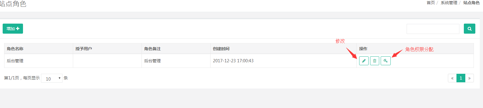 二、角色添加成功后展現(xiàn)方式如下圖列表,并可進(jìn)行修改、刪除、權(quán)限分配
