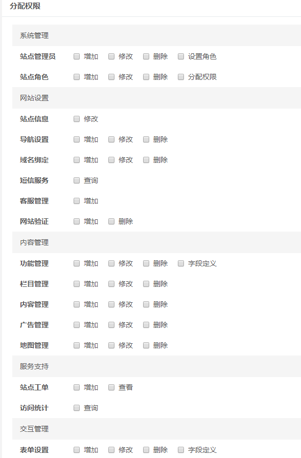 設(shè)置站點(diǎn)角色名稱(一般可分為:管理員、后臺(tái)管理、前臺(tái)頁(yè)面編輯、文章內(nèi)容管理等等多種角色),并可進(jìn)行修改、刪除、權(quán)限分配,具體操作如下步驟: