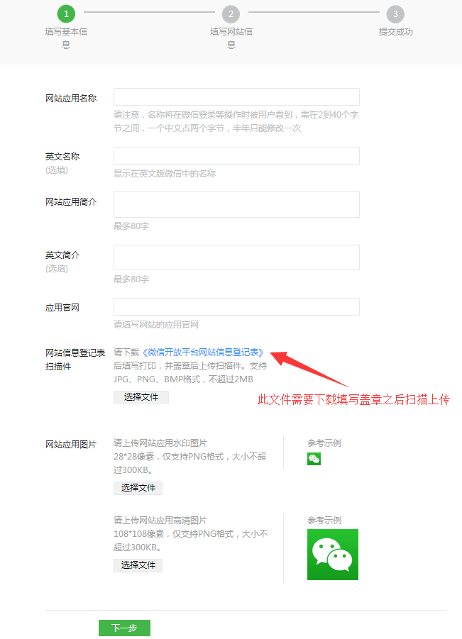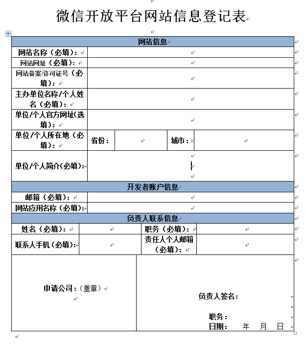 微信開放平臺網站信息登記表,此文件需要下載填寫、蓋章之后掃描上傳