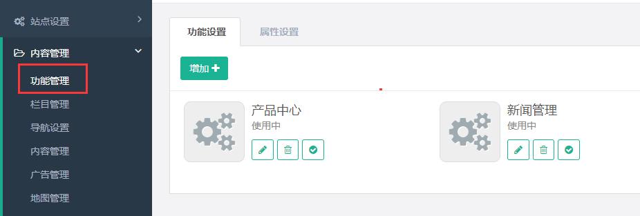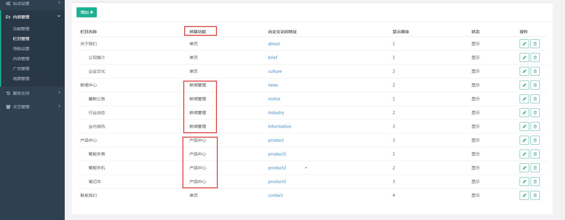 我們在欄目管理處對頁面設置所屬功能,那么這些相對應的所屬功能就會跟著編輯器中功能頁面結構一致。