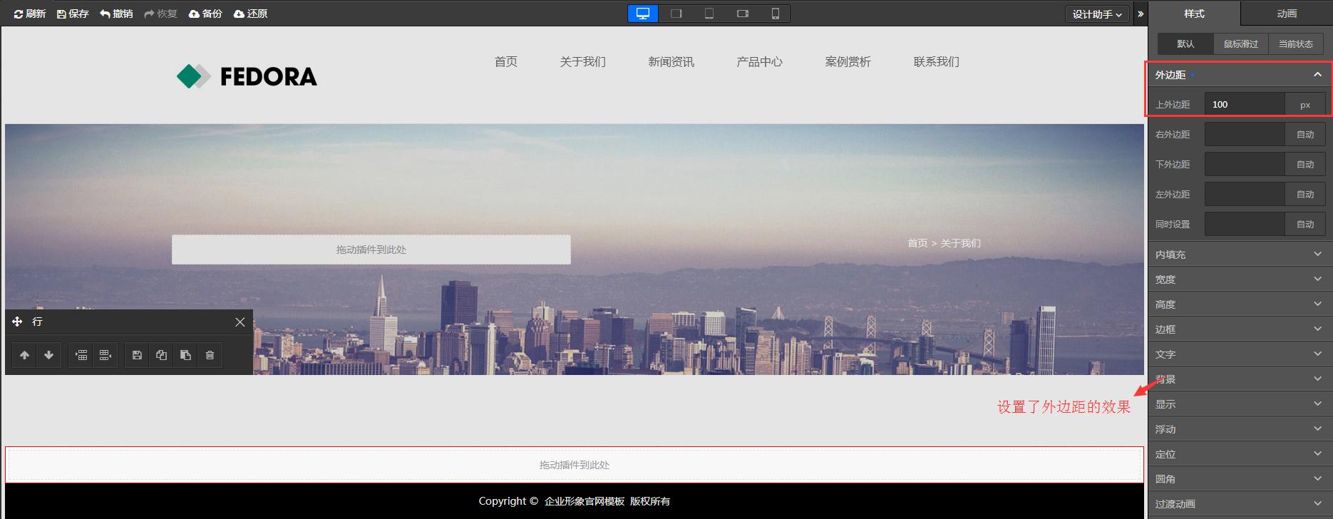 在編輯器的右側設置了外邊距(上)100px(PX相當于像素)。